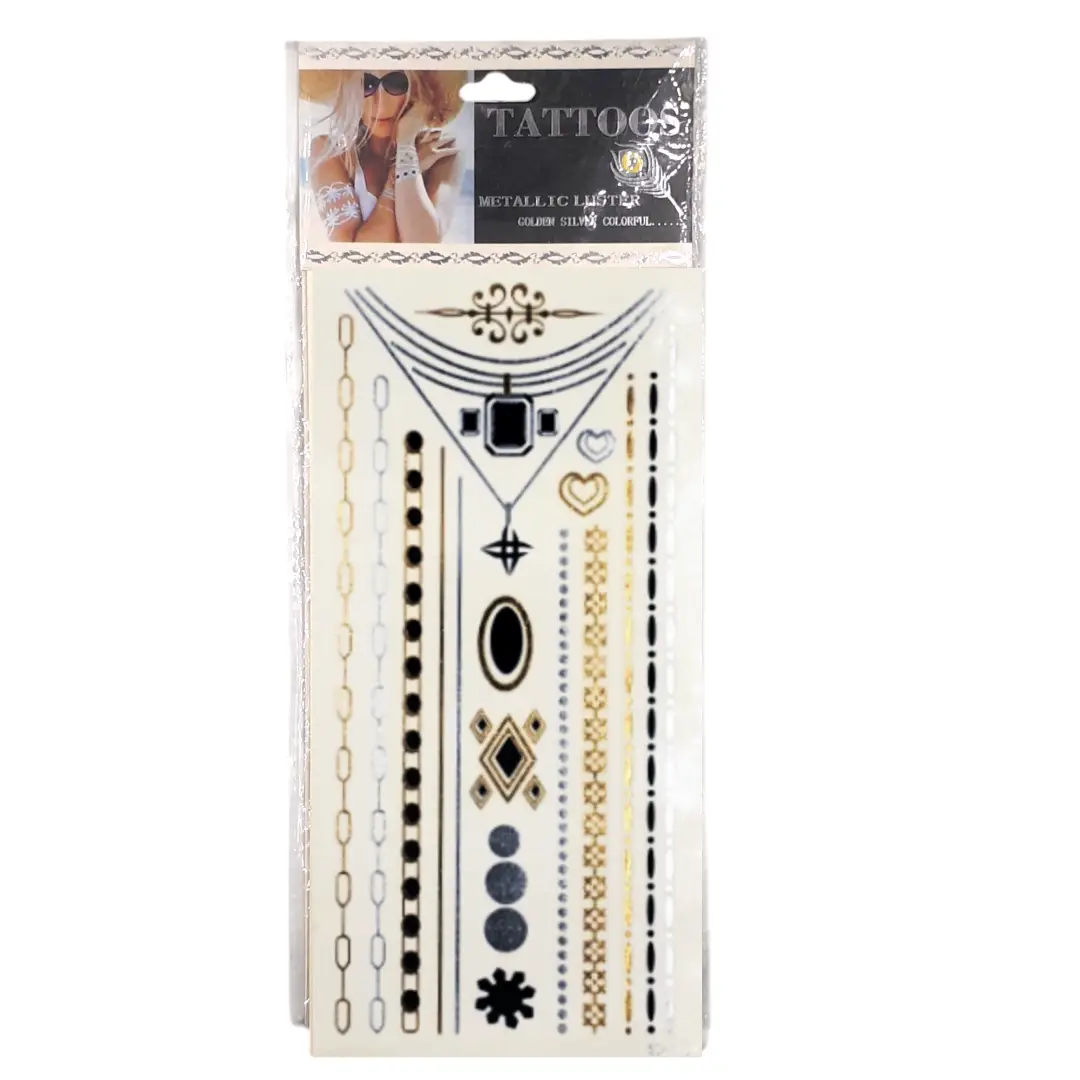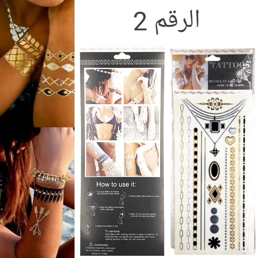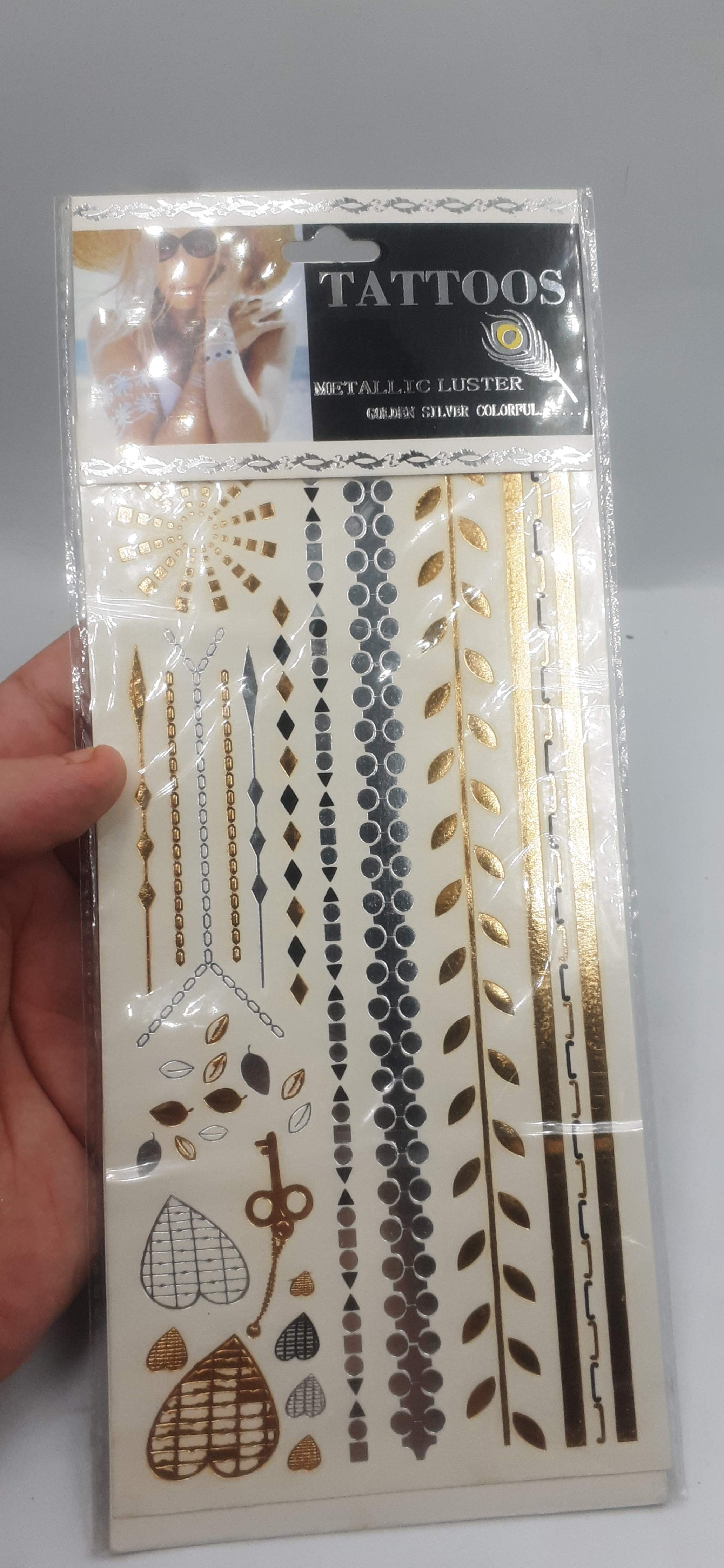 مجموعة من الوشوم المؤقتة ذات التصميمات الأنيقة باللونين الذهبي والفضي، تمنح بشرتك لمسة من التألق والتميز. مثالية للحفلات، المناسبات الخاصة، والإطلالات العصرية الجريئة.