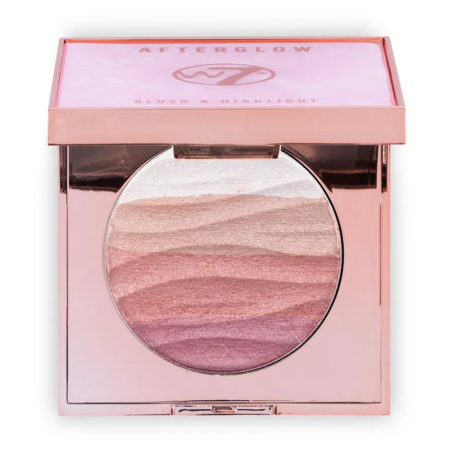 بودرة الخدود والهايلايتر W7 Afterglow Blusher & Highlight Compact – Pink & Gold هي مستحضر مزدوج يمنح لمسة متوهجة تجمع بين اللون الوردي واللمعان الذهبي. مناسب للاستخدام اليومي والمناسبات، يعطي إشراقة شبابية وتوهجًا طبيعيًا للبشرة.
