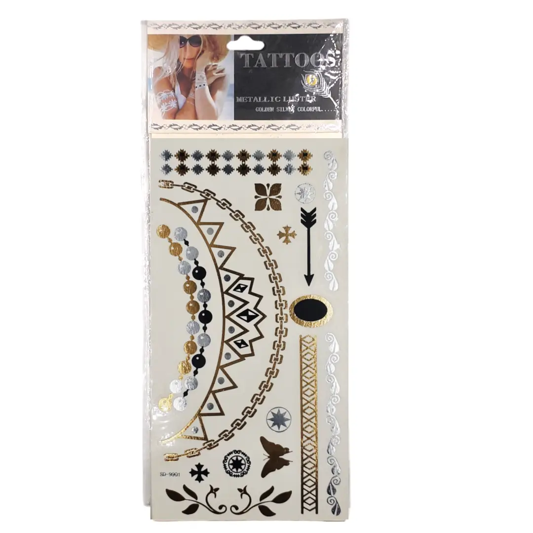 مجموعة من الوشوم المؤقتة ذات التصميمات الأنيقة باللونين الذهبي والفضي، تمنح بشرتك لمسة من التألق والتميز. مثالية للحفلات، المناسبات الخاصة، والإطلالات العصرية الجريئة.