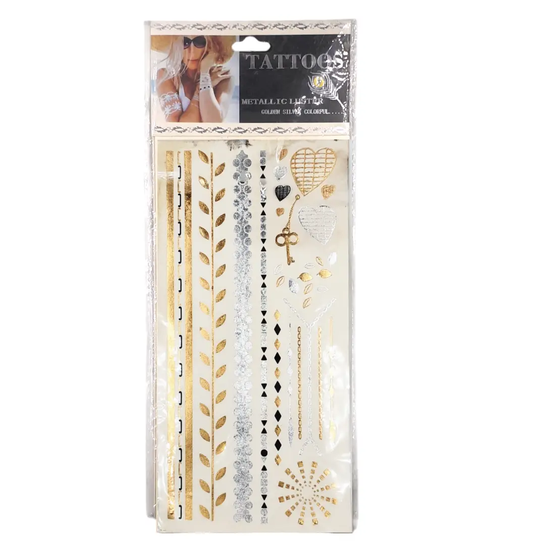 مجموعة الوشوم المعدنية METALLIC LUSTER تقدم تصاميم أنيقة باللونين الذهبي والفضي لإضفاء لمسة عصرية براقة على البشرة. مثالية للحفلات، المناسبات الخاصة، والإطلالات الجريئة، وتمنحك مظهرًا لافتًا يدوم لعدة أيام.
